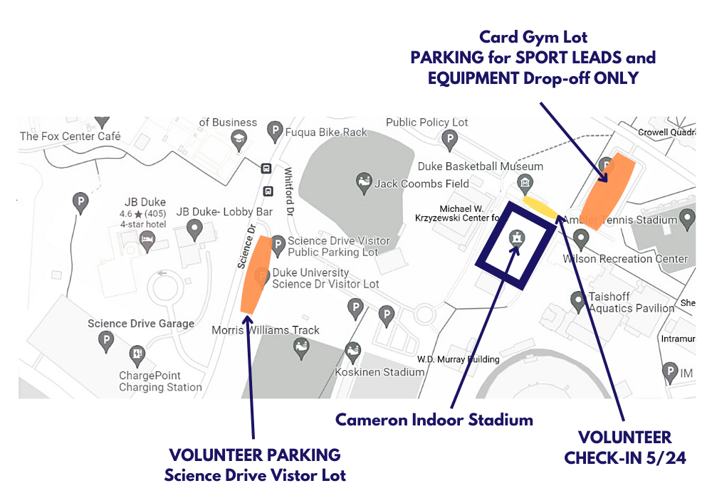 I am volunteering at Duke on 5/20 for set up- where do I park and check in for my shift?