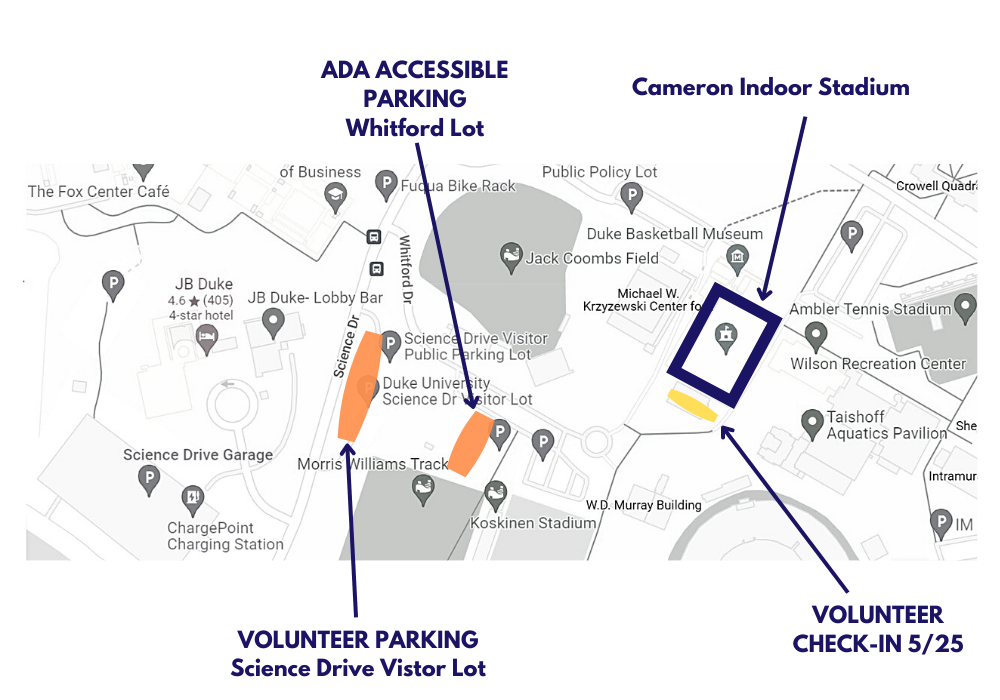 I am volunteering at Duke on 5/21- where do I park and check in for my shift?