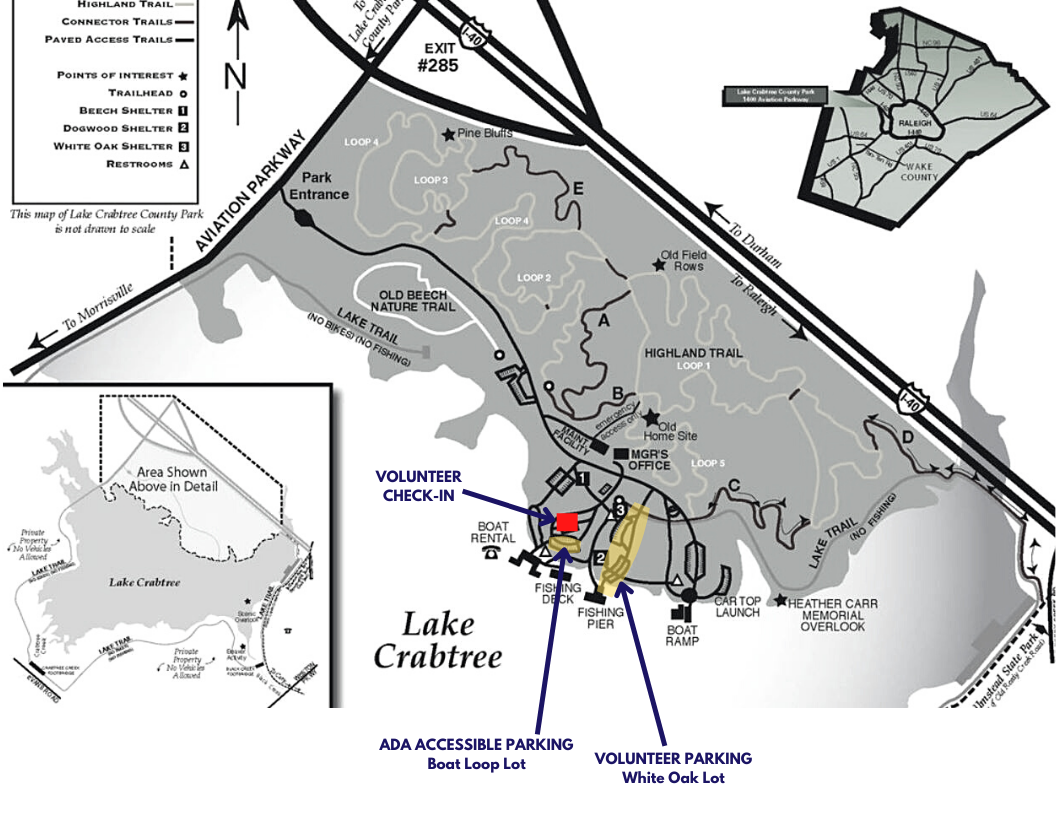 I am volunteering at Lake Crabtree on 5/22- where do I park and check in for my shift?